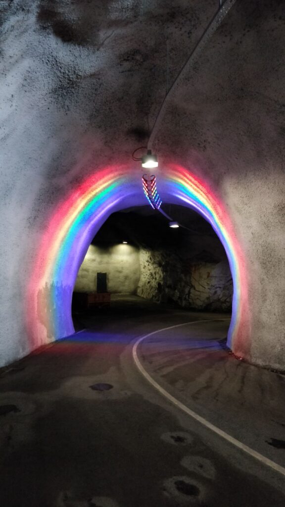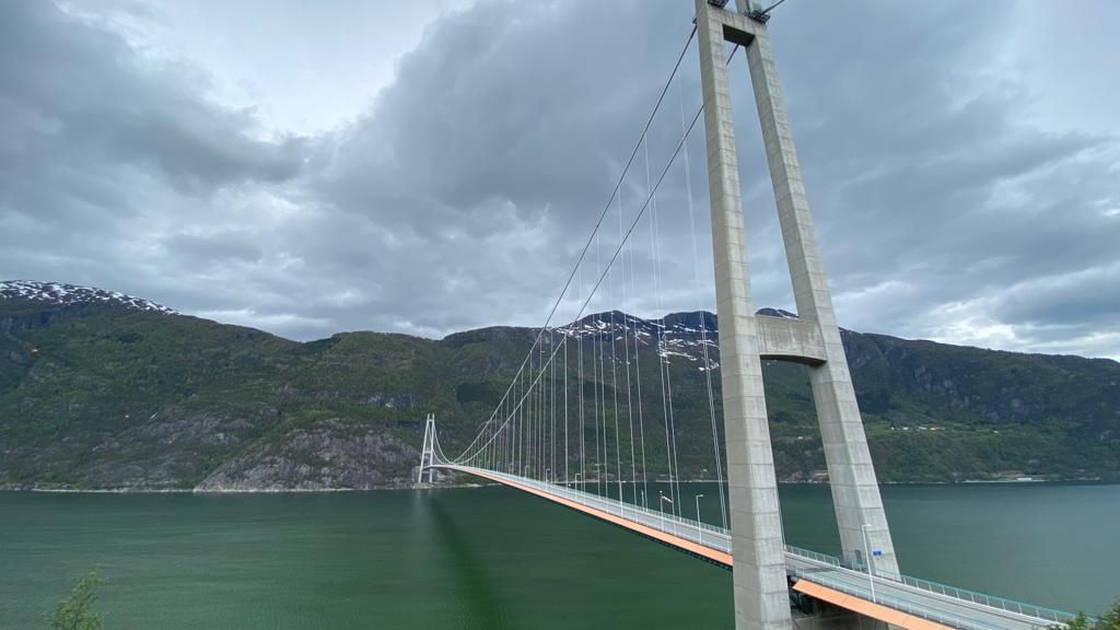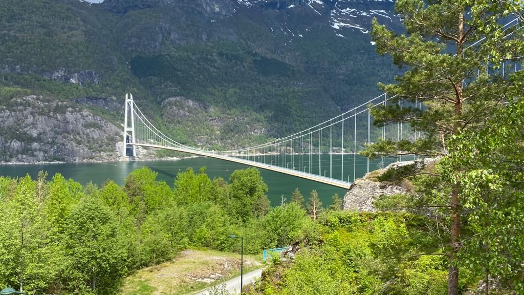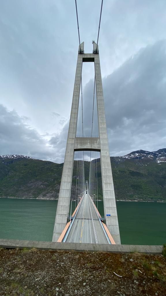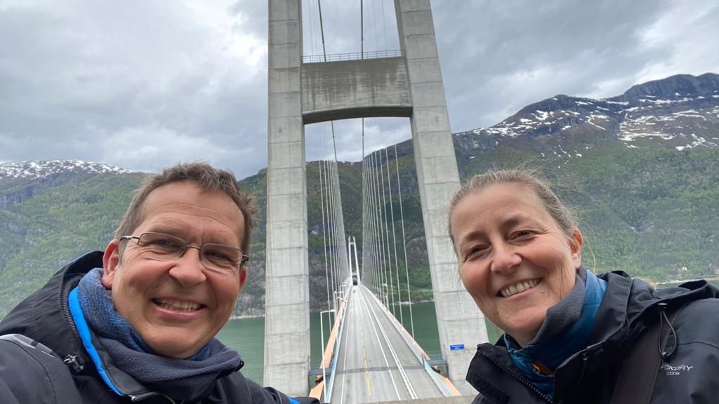 Also ab nach Bergen mit Zwischenstopp an der „Hardangerbru“ (Hardangerbrücke), über die wir dann auch weitergefahren sind (gegen eine kleine „Spende,“ von 117 NOK). Hier haben wir Phil aus der Schweiz kennengelernt: 69 Jahre alt, 2 künstliche Hüften und allein mit dem Fahrrad unterwegs – ein echtes Original und krass gut drauf!!!