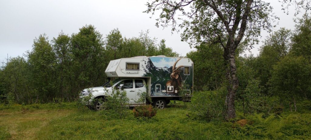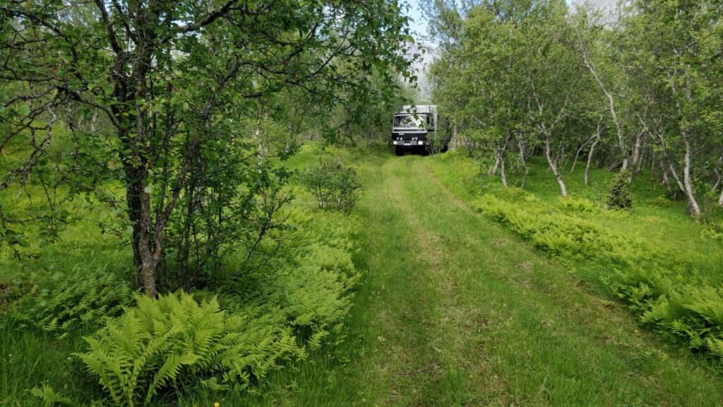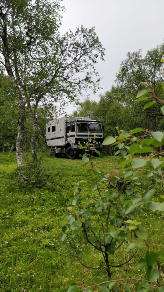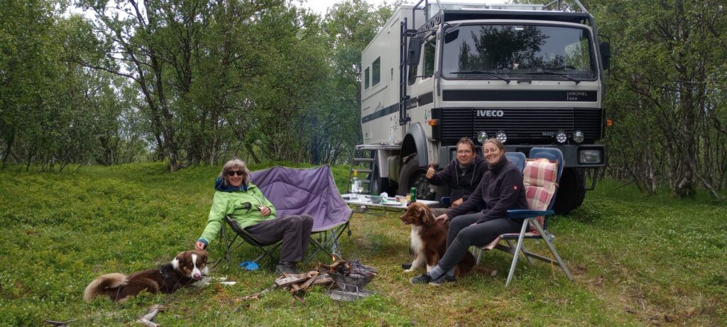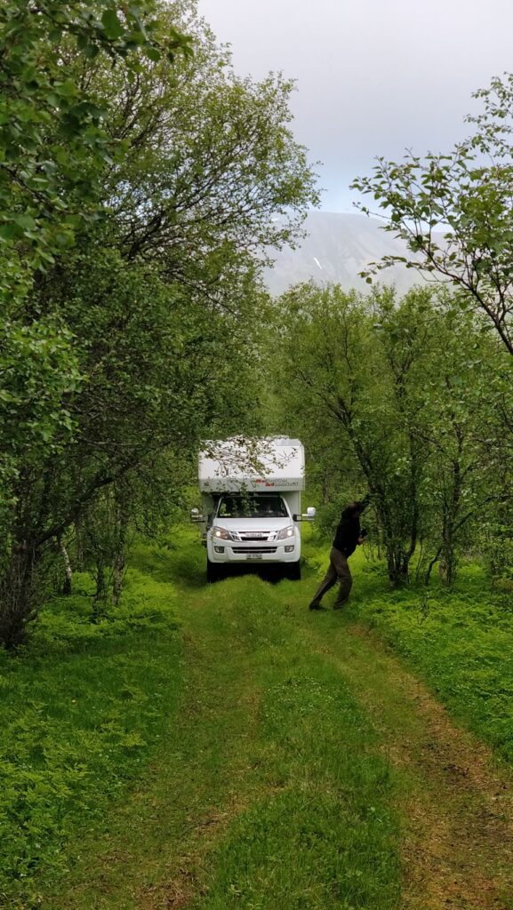 Wir machen uns auf die Suche nach unserem anvisierten und als Offroad-Platz ausgewiesenen Ziel für heute. Zur Sicherheit erkunden wir die Zufahrt durch den Wald erstmal zu Fuß, scheint machbar , ich mache die Kamera klar und Thom holt den KRÜMEL … und wen gabelt er unten an der Straße auf? 3 x dürft ihr raten – – es sind natürlich „unsere Schweizer“ mit ihrem tollen Bimobil.