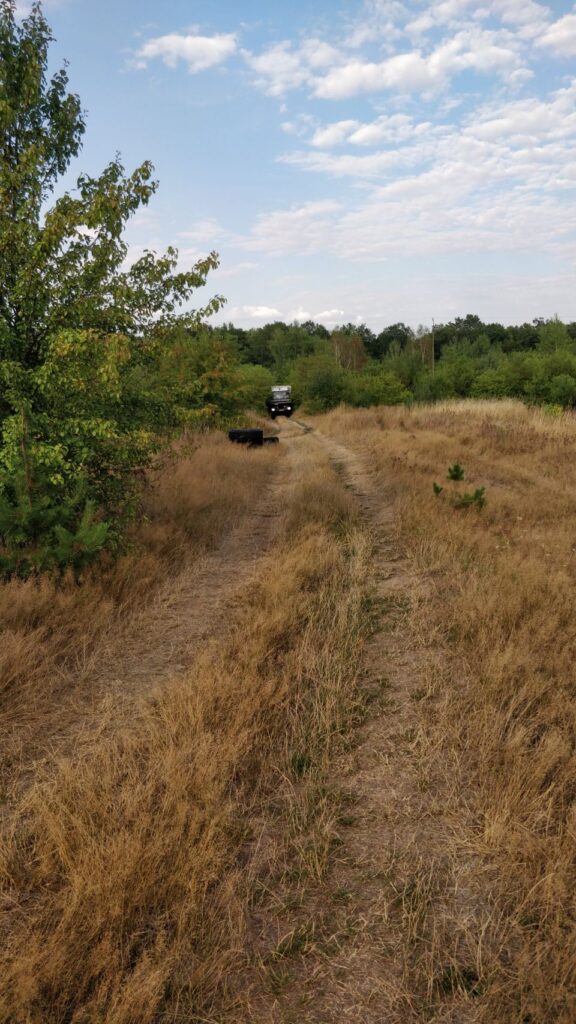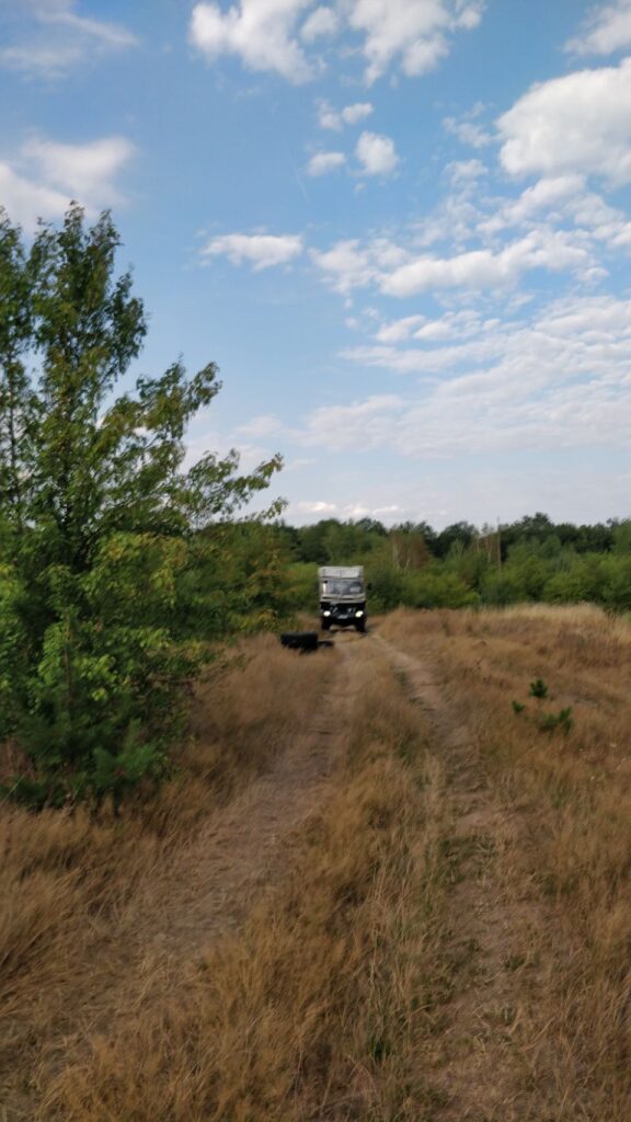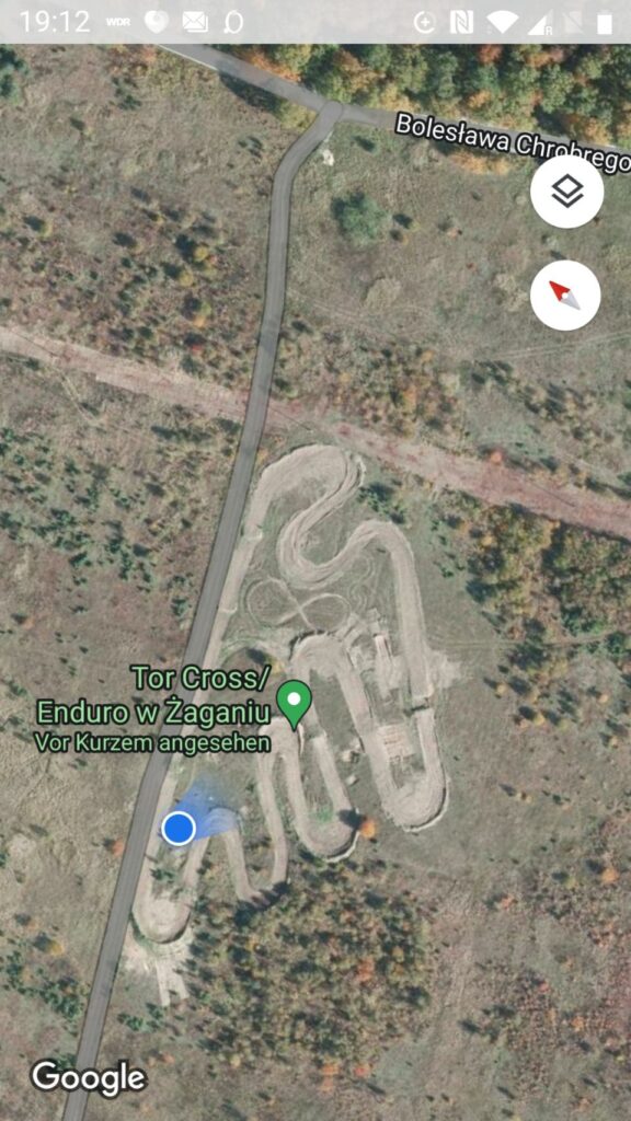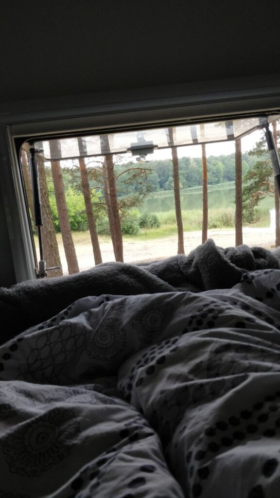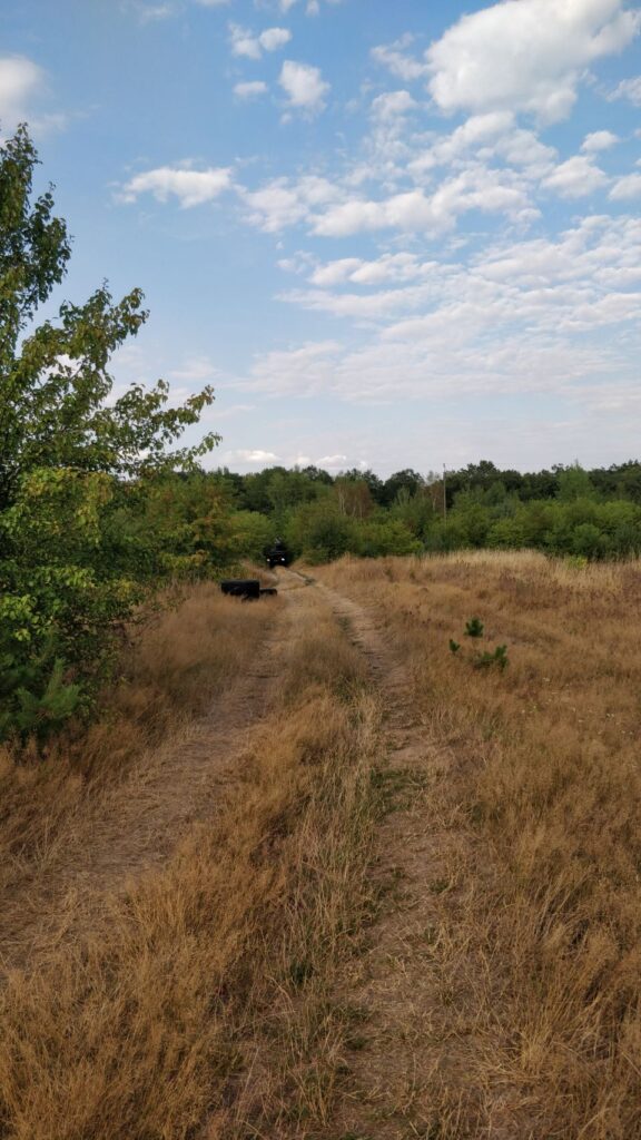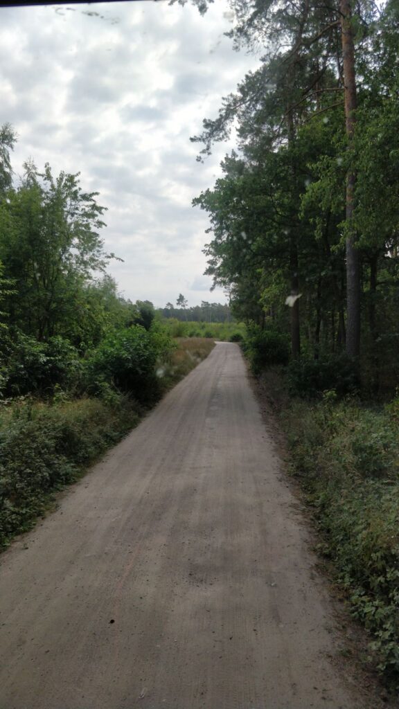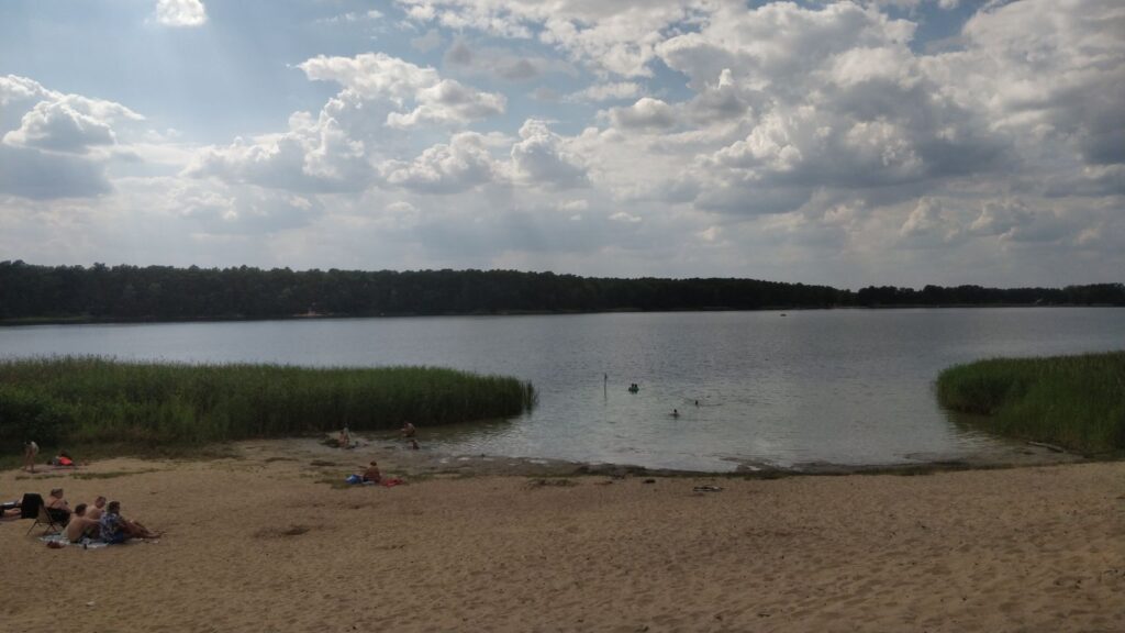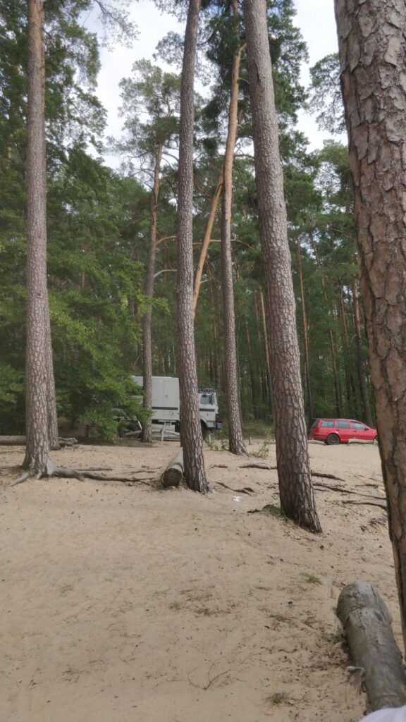 Vom Angelsee über einen kleinen See-Badestrand, wo wir Pause machen, geht’s zum nächsten Übernachtungsplatz an einer aufgegebenen Motocross-Strecke – leider komplett zugewuchert, also bleibt die Husky auf dem Träger…