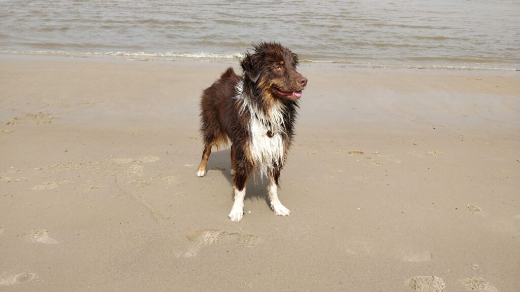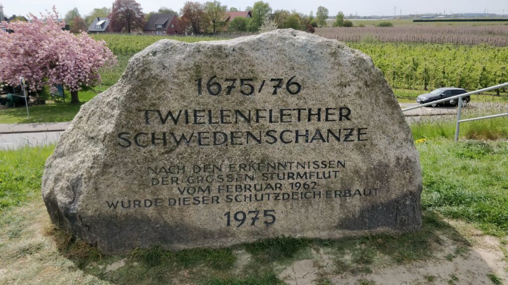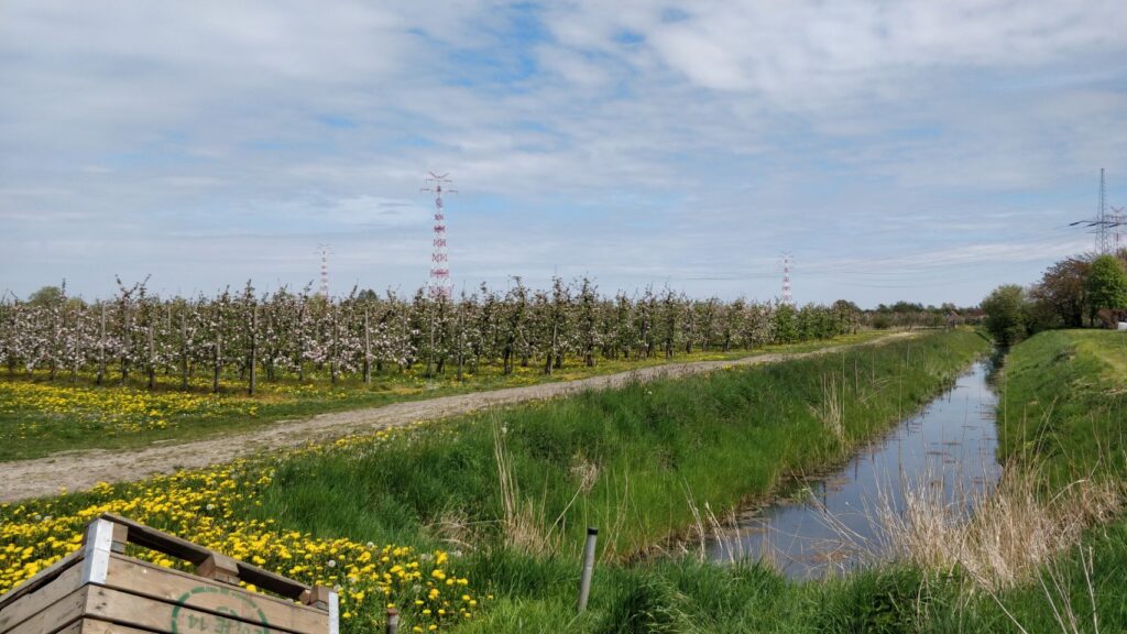 # Day 4: Hollern-Twielenfleth. Die heutige Tagesetappe hat nur 30 km und endet auf dem Blütenspanner-Treffen auf dem Obsthof Schacht im Alten Land. Bevor im Laufe des Tages jede Menge andere „Bekloppte“ mit der gleichen Leidenschaft fürs Reisen mit den verschiedensten (Offroad-)Wohnmobilen eintreffen, machen wir einen tollen Spaziergang auf und übern Deich. Cuba macht zum ersten Mal Bekanntschaft mit Strand und Wasser… und findet es voll mega!!!