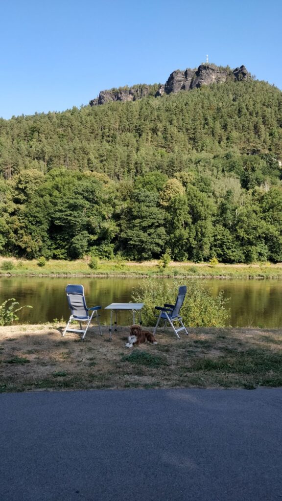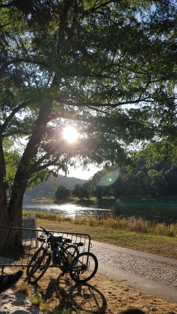 Nach einem Frühstück an der Elbe mit mega leckeren frischen Brötchen (hatten wir ewig nicht, jetzt gemerkt, wie geil so frische Brötchen schmecken ) und einen Frühbad in der Elbe werden die Wanderschuhe angezogen und los geht’s.