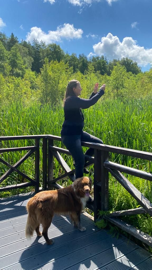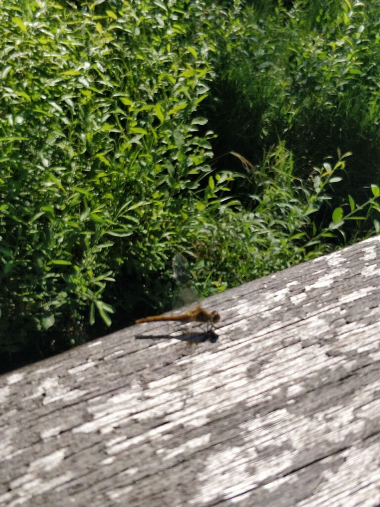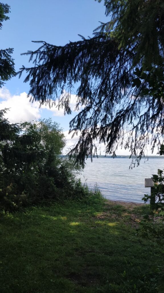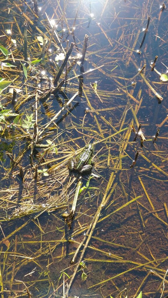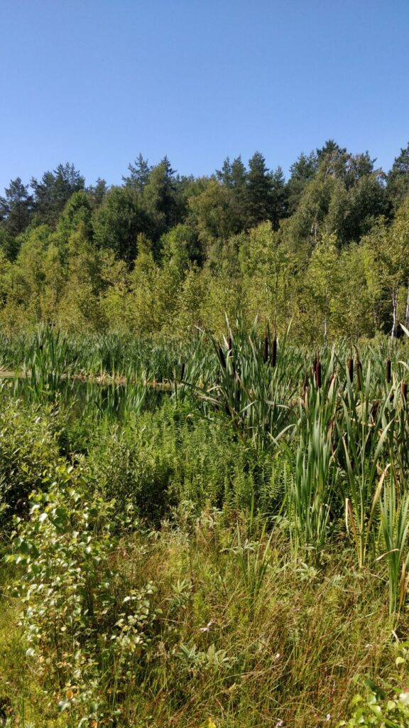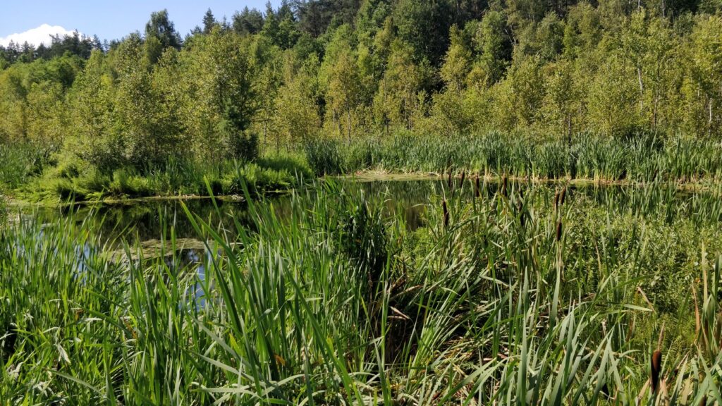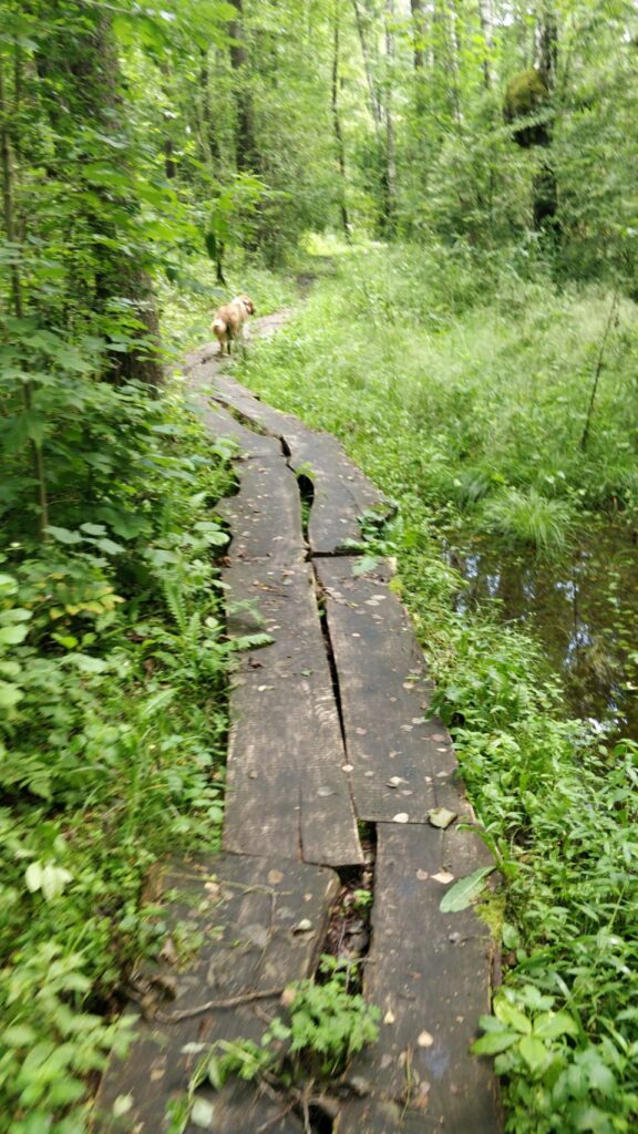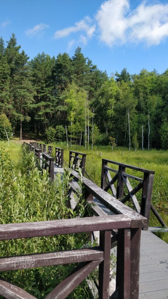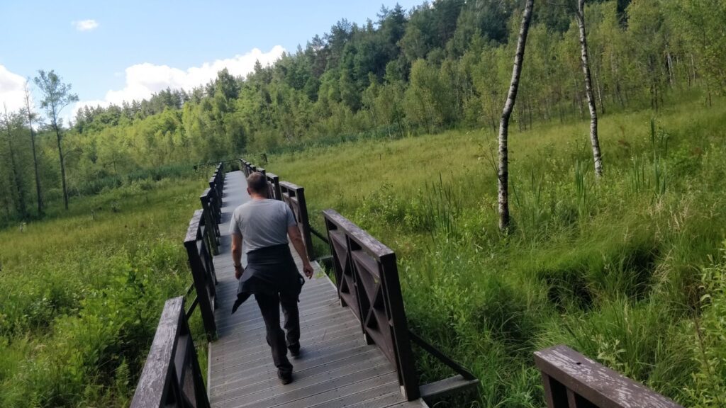 Nach dem Frühstück und bevor wir nach Polen weiterfahren, machen wir einen Waldspaziergang, der von dem Parkplatz hier im Meteliu Nationalpark losgeht. Es ist ein schöner (Coco-tauglich entspannt zu gehender) Weg durch den Wald und führt an einem kleinen Sumpfgebiet mit Steg zum Gucken vorbei. Dort gibt es reichlich Frösche und auch Mücken und so schließt sich der Kreis: Mücken – Frösche – Störche… …