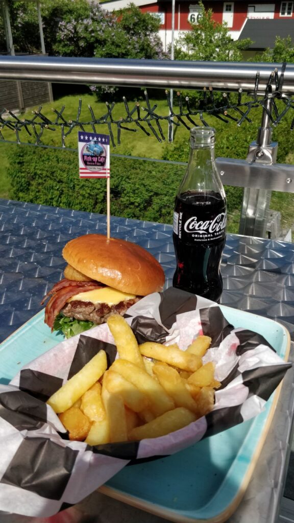 Und – weil heute mal schönes Wetter war, konnten wir Cuba mitnehmen und im Außenbereich des Restaurants unsere – wirklich leckeren – Burger essen
