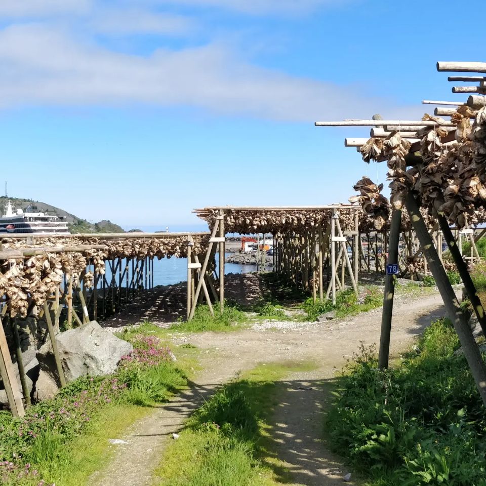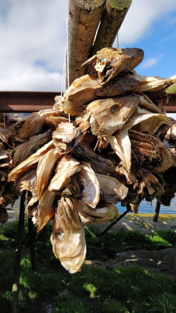 Danach gucken wir uns eine von den „Fisch-Plantagen“ an, die sieht man hier überall: große Gestelle aus Holz, auf denen Fische getrocknet werden. Man riecht sie nicht, bevor man sie sieht ……und in Nahaufnahme kommt das schon ein bisschen gruselig rüber .