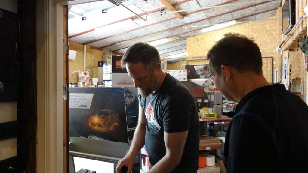 Nachdem Thom die Ausfahrt von der Waldlichtung nochmal für einen kleinen Offroad-Exkurs genutzt hat, hielten wir noch für einen kurzen Stopover bei Thomas‘ Showroom/Outdoorladen – der Kerl ist ein echter Multitasker mit nicht nur einem Business am Start (siehe Schilderwand … ).