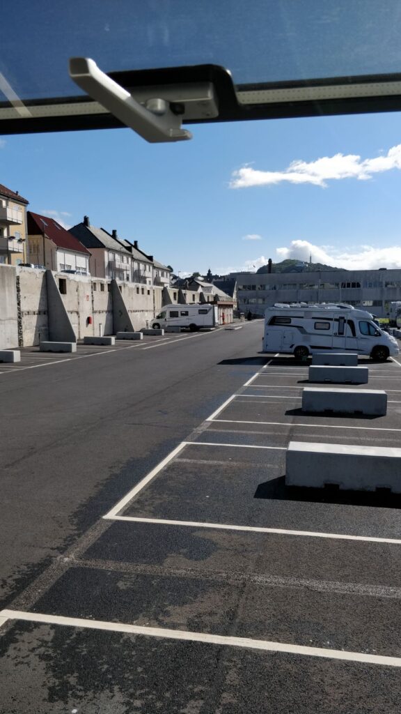 Keine großen Pläne für heute und der Stellplatz in Ålesund ist bis 15 Uhr bezahlt – nicht ganz billig (ca. 32€), aber stadtnah, nette Aussicht und alle Facilities inklusive, also Strom (brauchen wir allerdings nicht), Frischwasser, Abwasser, Wi-Fi und !!! ganz neue Duschen!!! Auf den Stell- oder Campingplätzen bisher kostete das Duschen immer 10 NOK für 4 oder 5 Minuten. Also nach dem Kaffee noch ganz gemütlich die (absolut grandiose) Dusche genutzt .