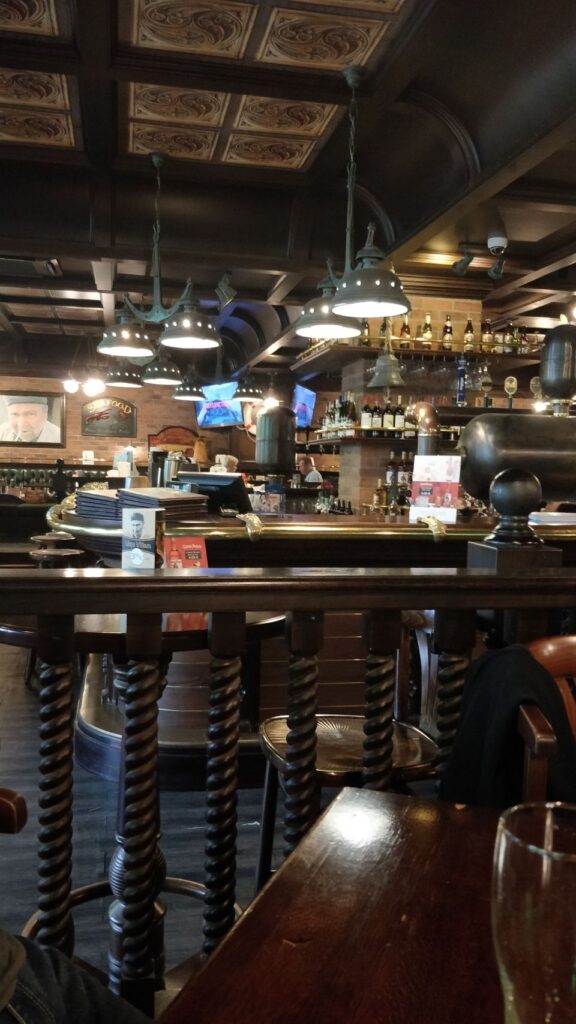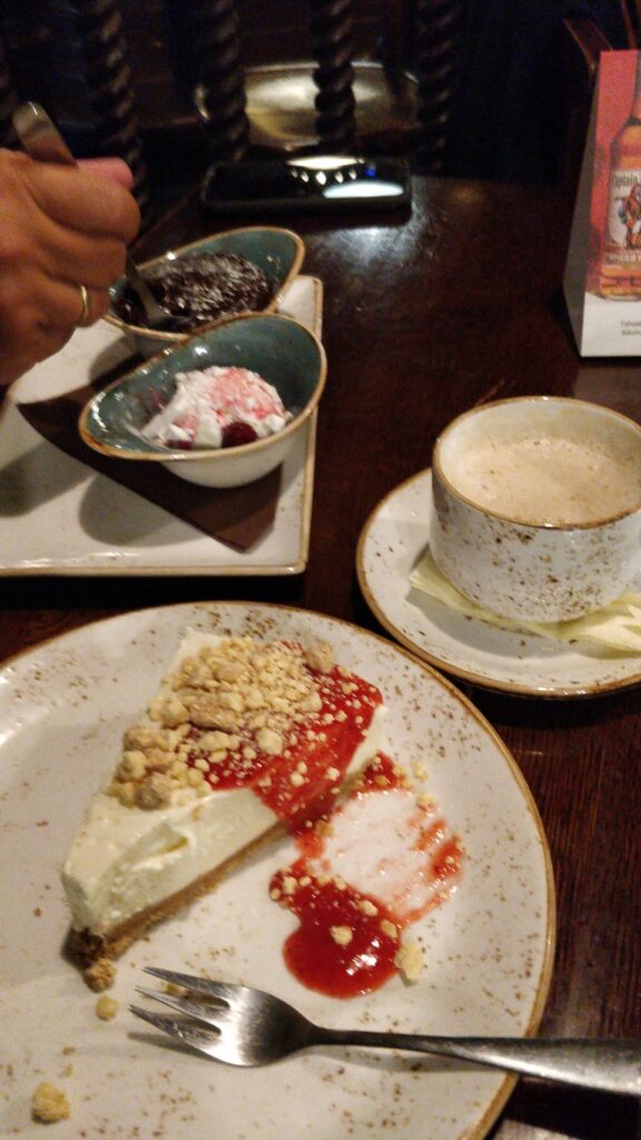 Um die Ecke ist ein großer Supermarkt – prima, wir wollten eh wieder Vorräte auffüllen. Und außerdem ist da auch ein super toller Pub, wo wir uns auf den Schreck – und außerdem auf unseren 1000. Abonnenten, den wir eigentlich heute feiern wollten – ein tolles Abendessen (mit Nachtisch und etlichen Getränken für 44 € – gut, dass wir nicht mehr Norwegen sind ) gönnen!