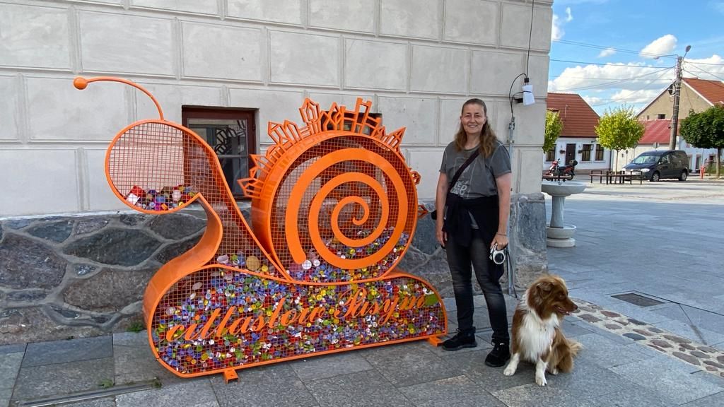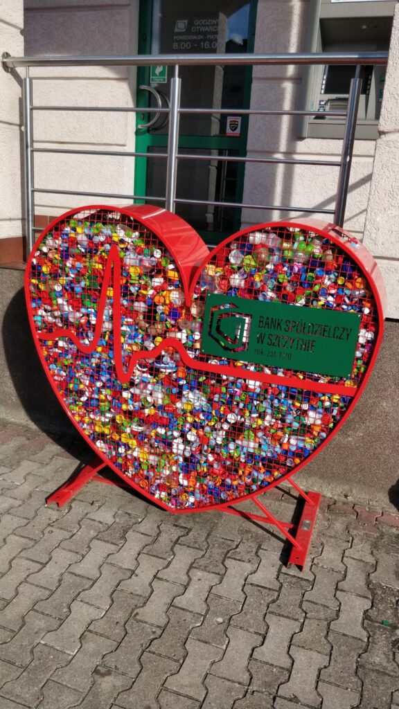 Die orange Schnecke und das Herz sind übrigens mit bunten Plastikdeckeln gefüllt – also Kunst aus Müll .