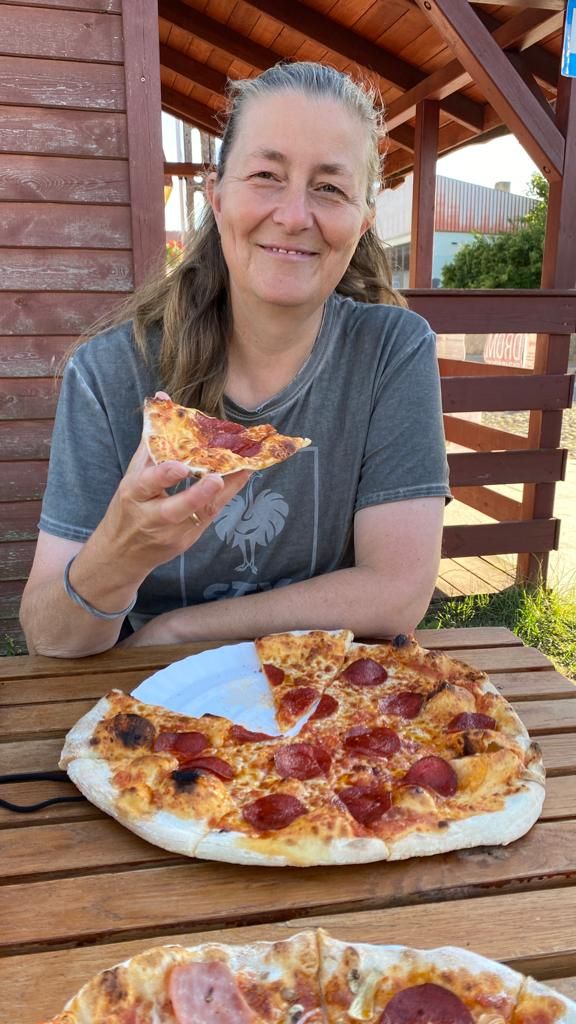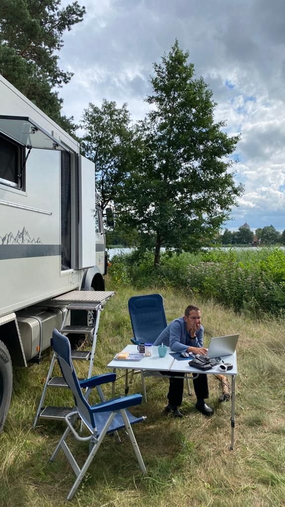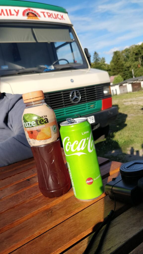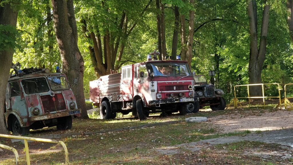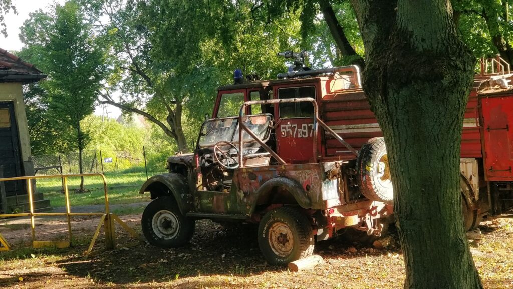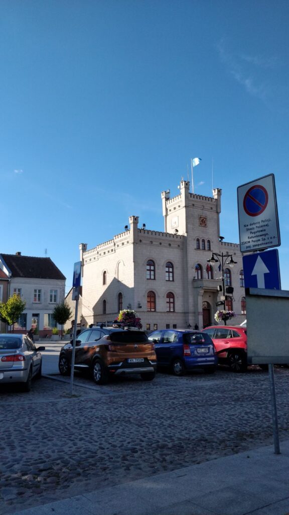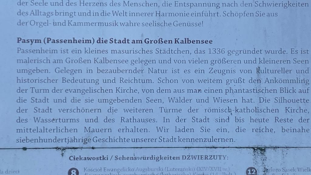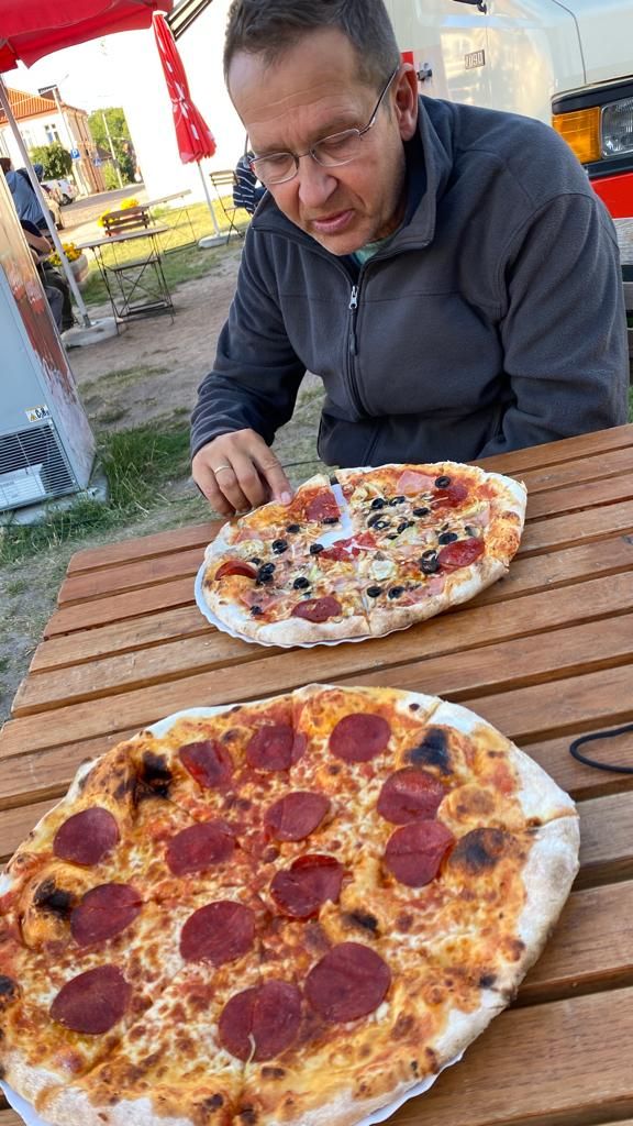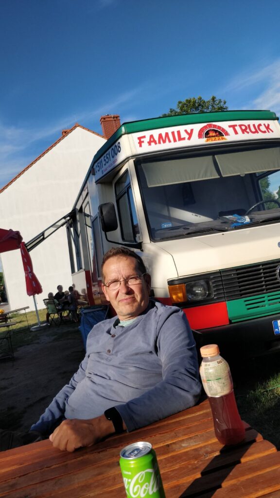 Am Nachmittag ist es wieder schön und wir machen uns auf in den Ort Pasym, ein ganz normales Dorf in den Masuren, klein, aber durchaus mit was zum Angucken: Die Bibliothek, das Rathaus mit Rathausplatz, diverse Kirchen, ein toller alter Wasserturm von 1911 mit einem sehr interessanten Fuhrpark (Thom hat sich den Jeep ausgesucht…), eine schöne Promenade am See – und ’ne leckere Pizza (zum Spottpreis) am Foodtruck gibt’s auch noch on top .